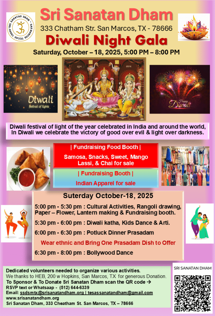 2. Diwali Night Gala: Saturday, October-18, 2025; 5:00 PM – 8:00 PM. Fundraising Food Booth, Indian Apparel, Cultural activity, Diwali Katha and Pot-Luke Dinner Prasadam and Bollywood Dance.