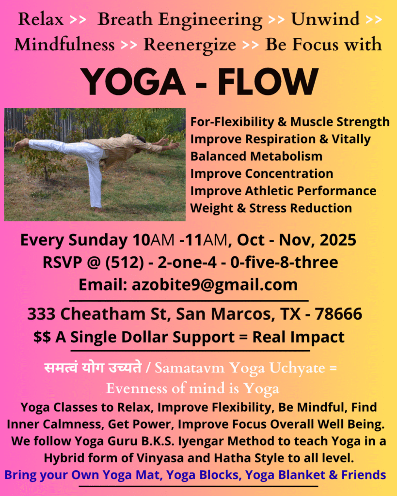 1. Yoga and Social for all level : Sunday, in the Month of September 10:00 AM – 11:00 AM. RSVP in-person or call or Text or Email.