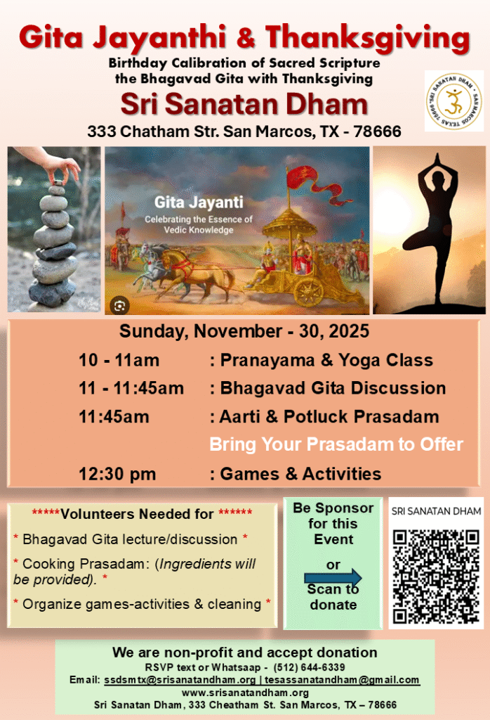 2. Gita Jayanthi & Thanksgiving: Sunday, November-30, 2025; 10:00 AM – 1:00 PM. Pranayama, Yoga, Bhagavad Gita Discussion, Aarti and Pot-Luke Lunch Prasadam followed by indoor and outdoor game.