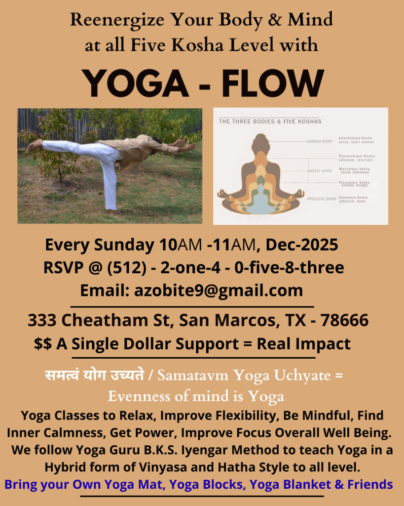 1. Yoga Flow for all level : Sunday, in the Month of December 10:00 AM – 11:00 AM. RSVP in-person or call or Text or Email.