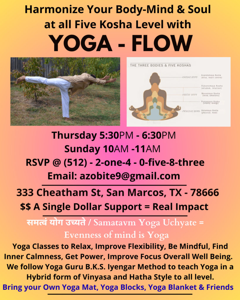 1. Yoga Flow for all level : Thursday 5:30 PM – 6:30 PM and Sunday 10:00 AM – 11:00 AM.