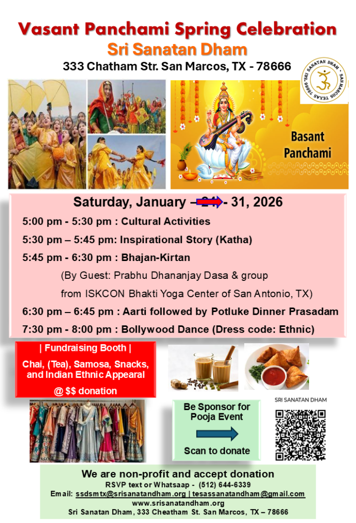 2. Vasant Panchami Spring – 2026 Celebration: Saturday, January-31, 2026; 5:00 PM – 8:00 PM. Cultural activities, Inspirational Stories, Bhajan-Kirtan, Aarti, Fundraising booth, Potluke Dinner and Bollywood Dance.