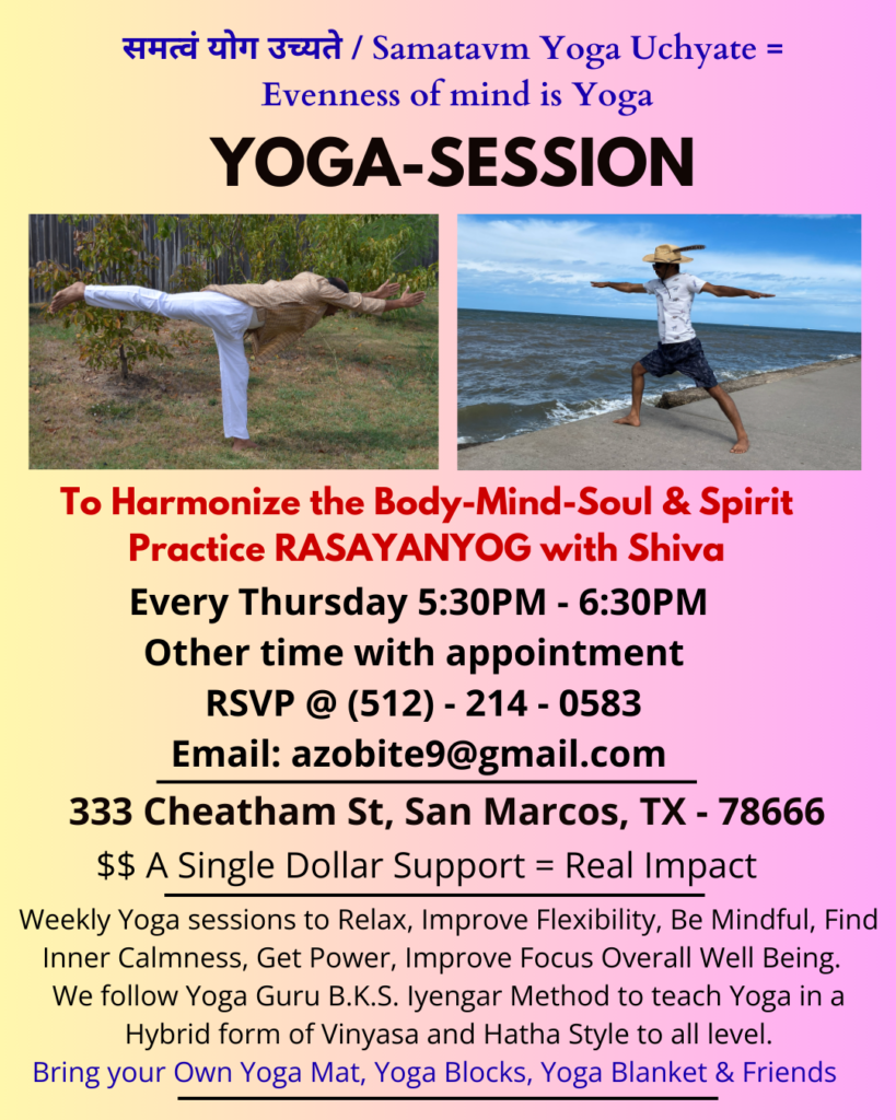 1. Yoga Sessions for all level : Every Thursday 5:30 PM– 6:30 PM. Other time with appointment RSVP @ 512-214-0583, Email: azobite9@gmail.com