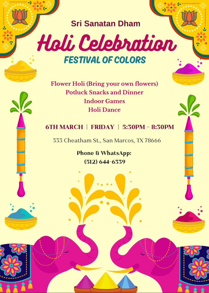 2. Holi Celebration: Friday, March – 06, 2026; 5:30 PM – 8:30 PM. Flower Holi, Potluck Snacks and Dinner, Indoor Games and Holi Dance at-