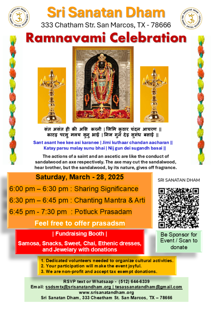 3. Ramnavami Celebration: Saturday, March – 28, 2026; 6:00 PM – 8:00 PM. Sharing significance, Chanting Mantra and Arti, and Potluk Prasadam at-