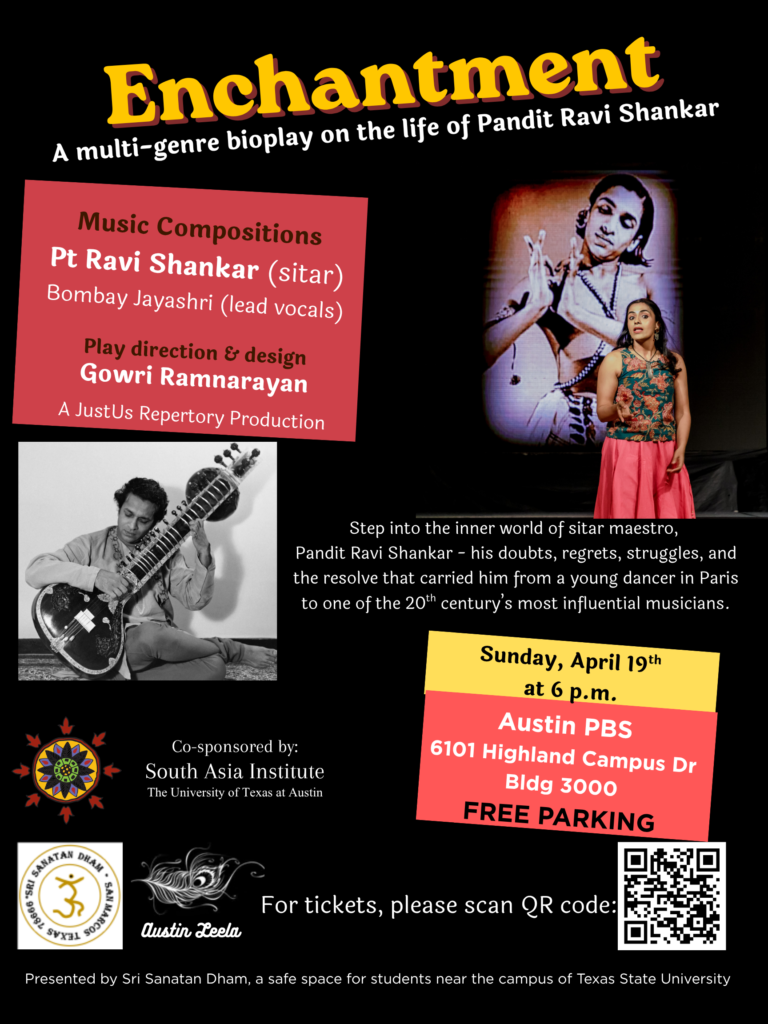 1. Sri Sanatan Dham is hosting enchantment a multi-genre bioplay on the life on Pandit Ravi Shankar. Sunday April-19, 2026 at 6 PM at Austin PBS 6101 Highland campus Dr. Build. 3000, Austin, TX. Scan the QR code to buy the ticket.